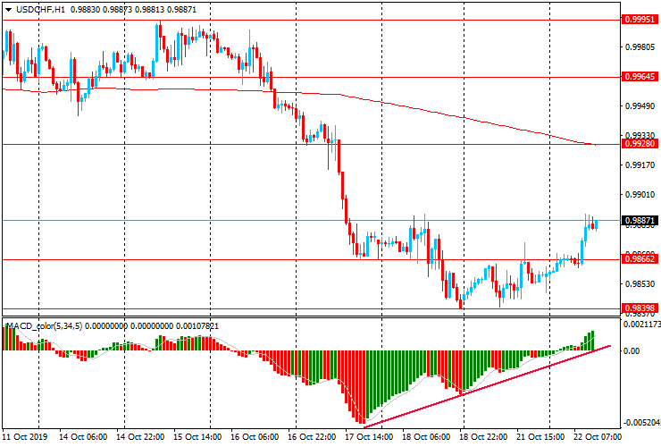 Пара USD/CHF торгуется с ростом, достигнув максимума 18 октября Chf0.9890 после снижения в пятницу до минимума 24 сентября Chf0.9840. USD/CHF опустилась ниже уровня скользящей средней МА (200) Н1 (Chf0.9930), и на четырехчасовом графике ниже МА (200) Н4 (Chf0.9925). В этой ситуации стоит продолжать придерживаться южного направления и искать точки выхода на продажу.