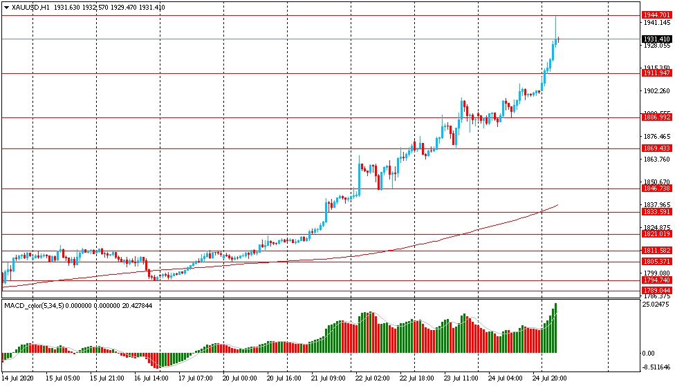 Основной сценарий продвижения пары — продолжение роста к $1944 (сессионный максимум). Альтернативный сценарий подразумевает закрепление ниже MA 200 H1 с последующим снижением к $1821 (минимум европейской сессии 21 июля).