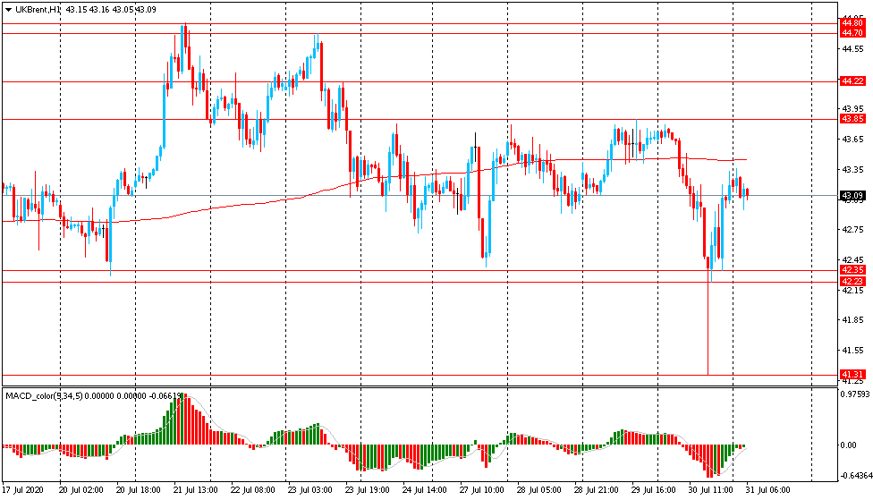 Основной сценарий продвижения пары — последующее снижение к $42.35 (минимум американской сессии 30 июля). Альтернативный сценарий предполагает закрепление выше MA 200 H1 с последующим ростом к $44.20 (максимум американской сессии 23 июля).