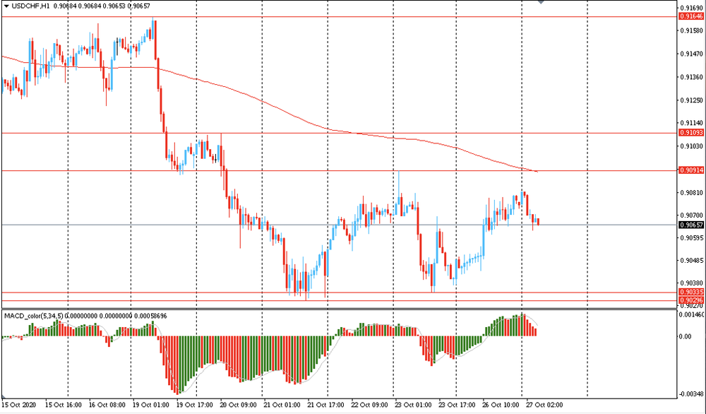 Основной сценарий продвижения пары — последующее снижение к Chf0.9035 (минимум 23 октября). Альтернативный сценарий — закрепление выше уровня MA 200 H1, с последующим ростом к Chf0.9165 (максимум 19 октябре).