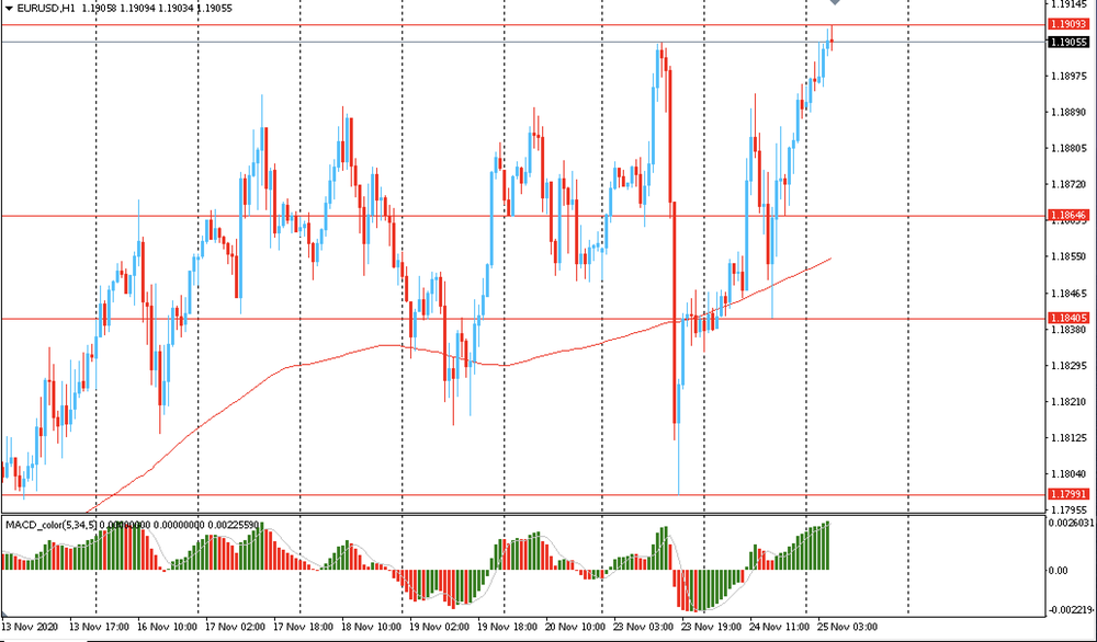 Основной сценарий продвижения пары — продолжение роста к $1.1910 (сессионный максимум). Альтернативный сценарий подразумевает закрепление ниже MA 200 H1, с последующим падением к $1.1800 (минимум 23 ноября).