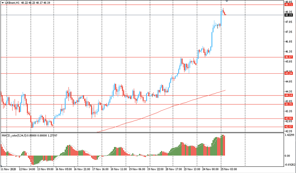 Вчера нефть марки Brent торговалась с повышением и закрыла день на положительной территории около цены $47.65. Сегодня нефть немного выросла, поднявшись к отметке $48.50. На часовом графике Brent все еще торгуется выше линии скользящей средней МА (200) Н1 ($44.40). На четырехчасовом графике ситуация аналогичная. Исходя из вышесказанного, вероятно, стоит придерживаться северного направления в торговле и пока Brent остается выше MA 200 H1, необходимо искать точки входа на покупку на формирование коррекции.