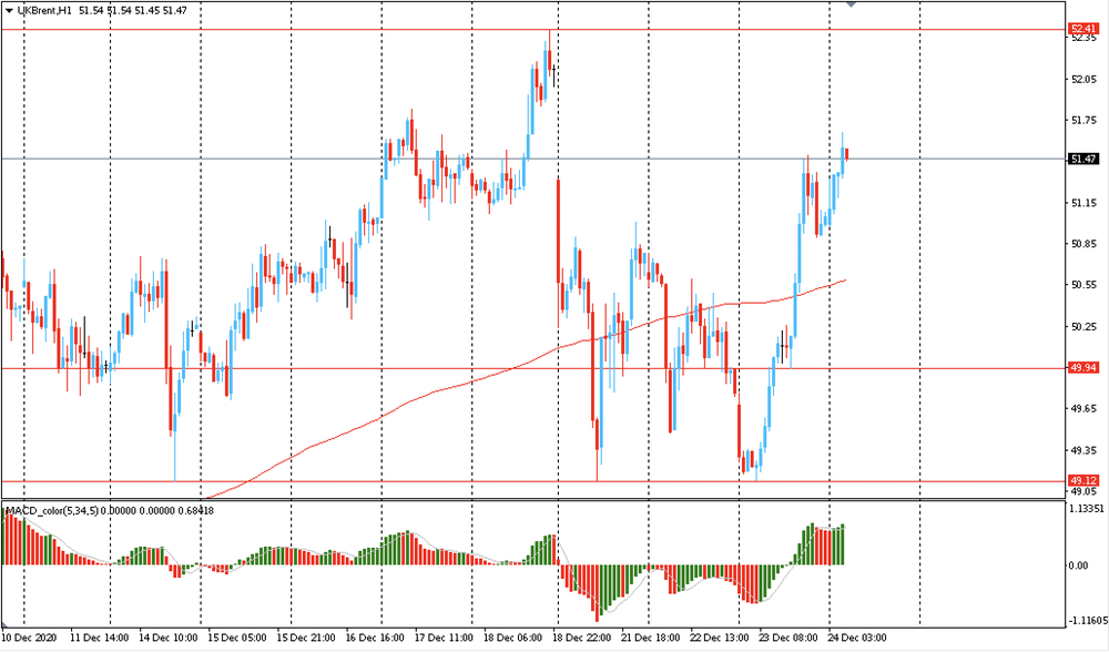 Основной сценарий продвижения пары — последующий рост к $52.40 (максимум 18 декабря). Альтернативный сценарий предполагает окончательное закрепление ниже MA 200 H1 с последующим снижением к $49.15 (минимум 23 декабря).