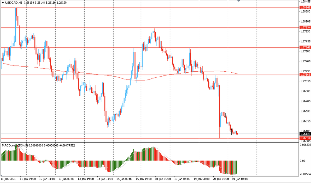 Основной сценарий продвижения пары — продолжение снижения к С$1.2605 (минимум 20 января). Альтернативный сценарий — окончательное закрепление выше МА (200) Н1 с последующим ростом к С$1.2830 (максимум 11 января).