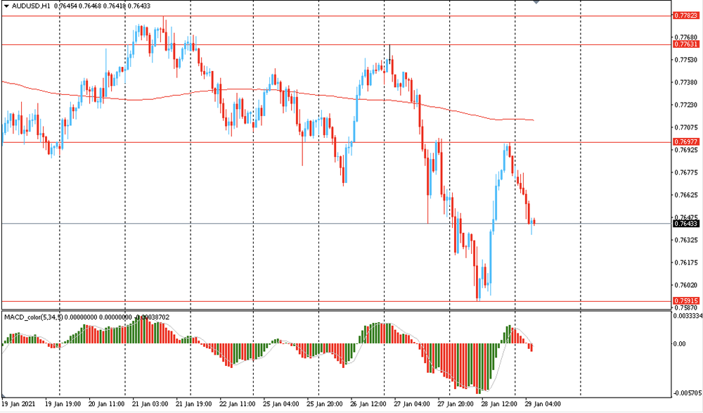 Основной сценарий продвижения пары — продолжение нисходящего движения к $0.7590 (минимум 28 января). Альтернативный сценарий - окончательное закрепление выше MA 200 H1 с последующим ростом к $0.7780 (максимум 21 января).