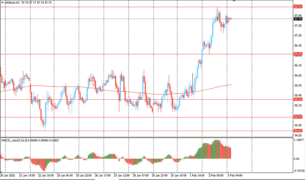 Основной сценарий продвижения пары — последующий рост к $58.10 (максимум 2 февраля). Альтернативный сценарий предполагает закрепление ниже MA 200 H1 с последующим снижением к $54.40 (минимум 22 января).