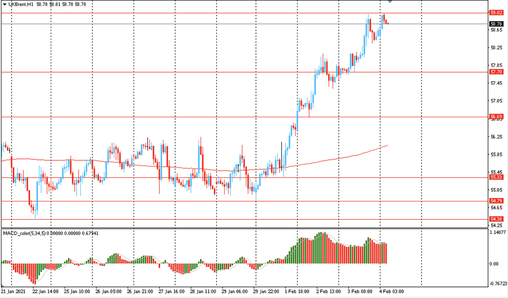 Основной сценарий продвижения пары — последующий рост к $59.00 (сессионный максимум). Альтернативный сценарий предполагает закрепление ниже MA 200 H1 с последующим снижением к $54.40 (минимум 22 января).