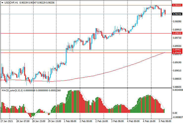Сегодня пара USD/CHF торгуется в диапазоне Chf0.9020-45 - около двухмесячного максимума. На часовом графике USD/CHF торгуется выше линии скользящей средней МА (200) Н1 (Chf0.8940) и на четырехчасовом графике - выше МА (200) Н4 (Chf0.8880). В этой ситуации, вероятно, стоит придерживаться северного направления в торговле и искать точки выхода на покупку.