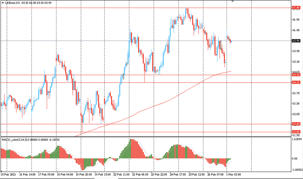 Основной сценарий продвижения пары — последующий рост к $67.40 (максимум 25 февраля). Альтернативный сценарий предполагает закрепление ниже MA 200 H1 с последующим снижением к $62.10 (минимум 19 февраля).