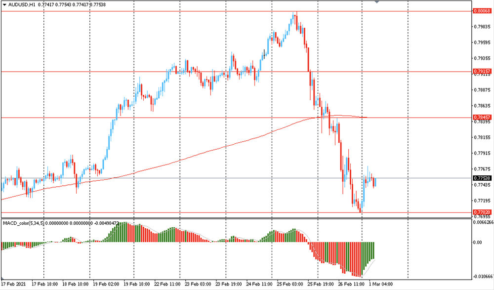 Основной сценарий продвижения пары — продолжение восходящего движения к $0.7845 (максимум американской сессии 26 февраля). Альтернативный сценарий - закрепление ниже MA 200 H1 с последующим снижением к $0.7705 (минимум 26 февраля).