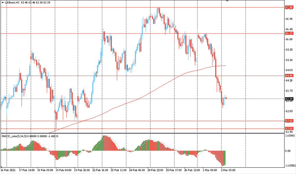 Основной сценарий продвижения пары — последующий рост к $67.40 (максимум американской сессии 1 марта). Альтернативный сценарий предполагает окончательное закрепление ниже MA 200 H1 с последующим снижением к $62.10 (минимум 19 февраля).