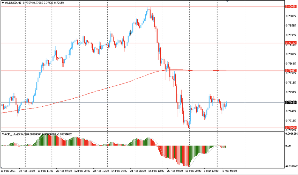 Основной сценарий продвижения пары — продолжение восходящего движения к $0.7845 (максимум американской сессии 26 февраля). Альтернативный сценарий - закрепление ниже MA 200 H1 с последующим снижением к $0.7705 (минимум 26 февраля).