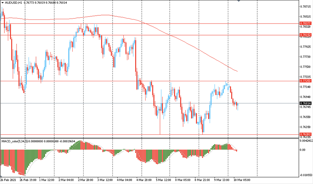 Основной сценарий продвижения пары — продолжение нисходящего движения к $0.7620 (минимум 9 марта). Альтернативный сценарий - окончательное закрепление выше MA 200 H1 с последующим ростом к $0.8005 (максимум 25 февраля).