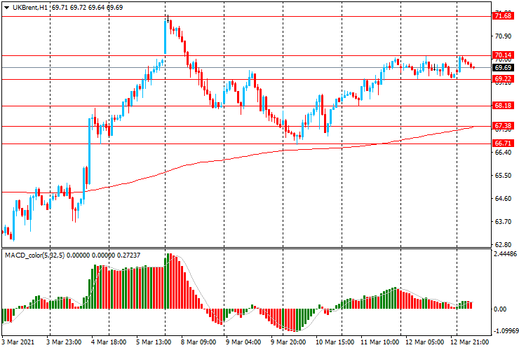 Основной сценарий продвижения пары — если сопротивление $70.15 (максимум 11-12 марта) будет пробито, то цена может подняться к $71.70 (максимум 8 марта).