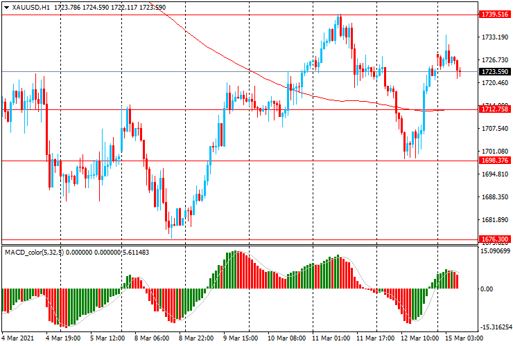 Основной сценарий продвижения пары — коррекция, снижение к МА (200) Н1 ($1712), и затем, может быть к $1698 (минимум 12 марта)