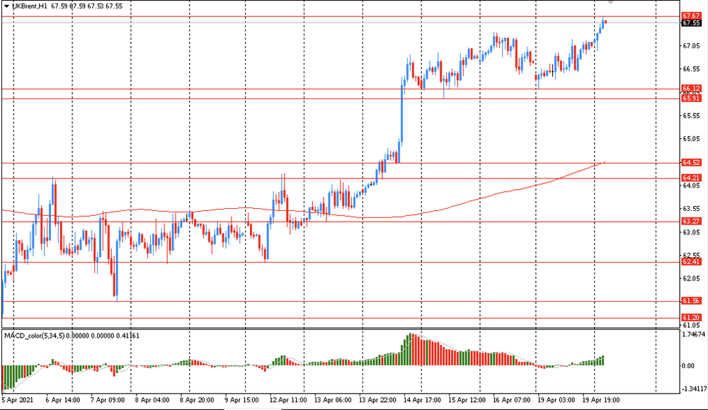 Основной сценарий продвижения пары — последующий рост к $67.65 (сессионный максимум). Альтернативный сценарий предполагает закрепление ниже MA 200 H1 с последующим снижением к $61.55 (минимум 7 апреля).