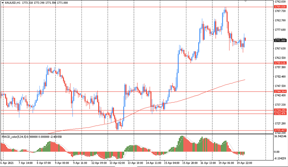 Основной сценарий продвижения пары — продолжение восходящего движения к $1789 (максимум 19 апреля). Альтернативный сценарий подразумевает закрепление ниже MA 200 H1 с последующим снижением к $1720 (минимум 5 апреля).