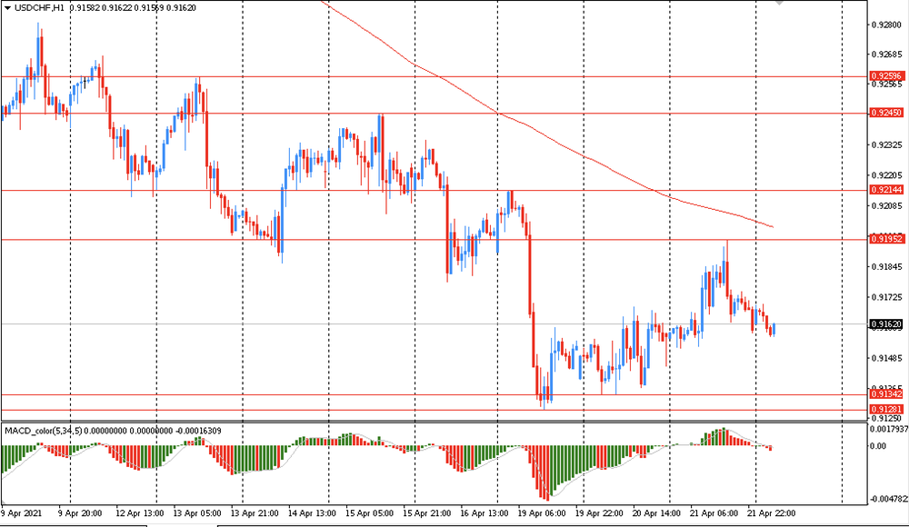 Основной сценарий продвижения пары — последующее снижение к Chf0.9135 (минимум 20 апреля). Альтернативный сценарий — закрепление выше уровня MA 200 H1, с последующим ростом к Chf0.9300 (максимум 8 апреля).