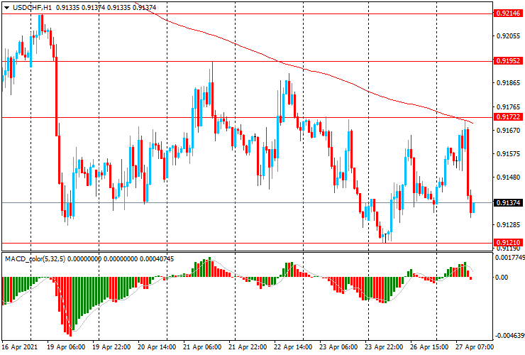 Альтернативный сценарий — если сопротивление Chf0.9170 (максимум 23 апреля, сессионный максимум, МА (200) Н1) будет пробито, то пара может подняться к Chf0.9195-0.9215 (максимумы 19 и 21 апреля)