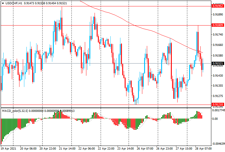 Альтернативный сценарий — если сопротивление Chf0.9180-95 (максимумы 21-22 апреля, сессионный максимум) будет пробито, то пара может подняться к Chf0.9215 (максимум 19 апреля)
