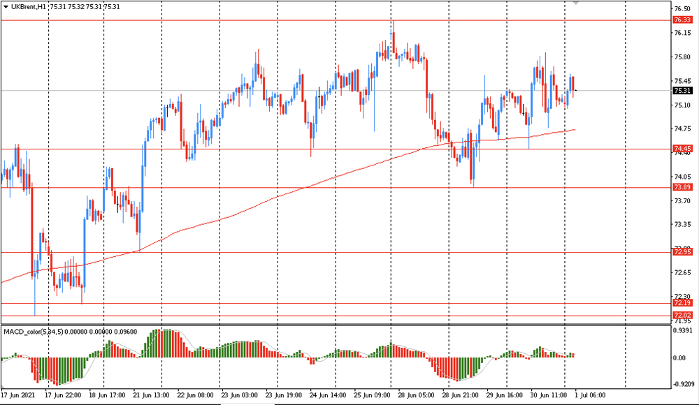 Основной сценарий продвижения пары — последующий рост к $76.30 (максимум 28 июня). Альтернативный сценарий предполагает закрепление ниже MA 200 H1 с последующим снижением к $72.20 (минимум 18 июня).