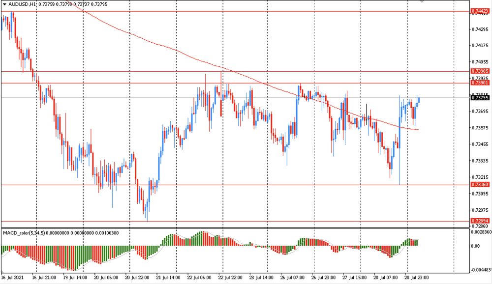 Основной сценарий продвижения пары — нисходящее движения к $0.7315 (минимум 28 июля). Альтернативный сценарий - окончательное закрепление выше MA 200 H1 с последующим ростом к $0.7500 (максимум 13 июля).