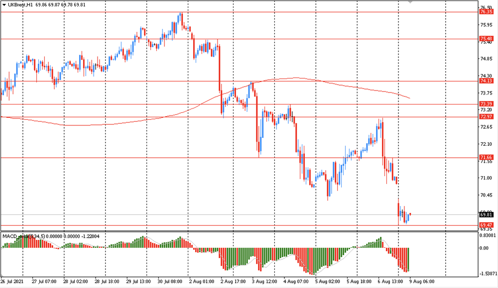 Основной сценарий продвижения пары — последующий спад к $69.50 (сессионный минимум). Альтернативный сценарий предполагает закрепление выше MA 200 H1 с последующим ростом к $76.35 (максимум 30 июля).