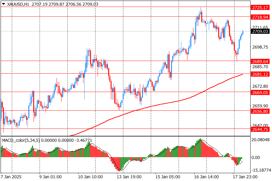 В пятницу пара XAU/USD в основном снижалась с 2718 до 2699, немного отступив от месячного максимума 2725, достигнутого на прошлой неделе в четверг. Сегодня золото начало торги в основном ростом в диапазоне 2689-2709. На часовом графике XAU/USD торгуется выше линии скользящей средней МА (200) Н1 (2681) и на четырехчасовом графике выше МА (200) Н4 (2652). Исходя из вышесказанного, вероятно, стоит придерживаться северного направления в торговле и пока золото остается выше MA 200 H1, необходимо искать точки входа на покупку на формировании коррекции.