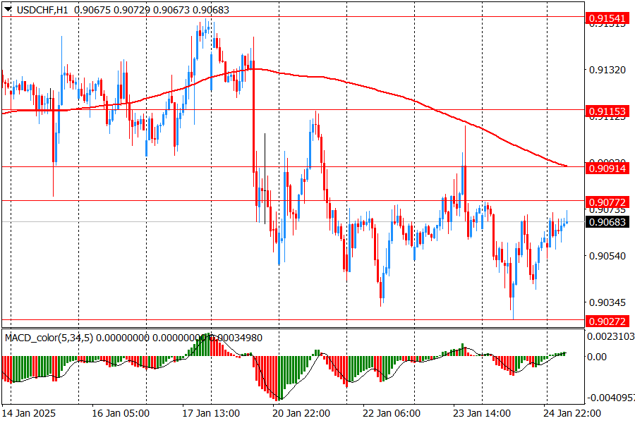 Основной сценарий продвижения пары предполагает прорыв сопротивления 0.9080-90 (максимум 24 января, МА (200) Н1) и может быть рост к 0.9100-15 (максимумы 21 и 23 января).
