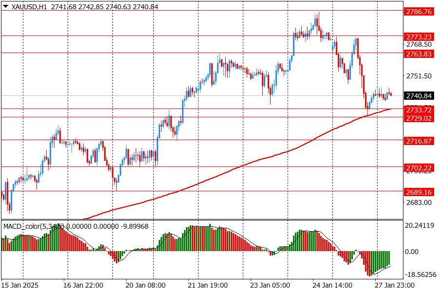 Вчера пара XAU/USD в основном снижалась с 2773 до 2729 и закрыла сессию около цены 2741. Сегодня золото начало торги в диапазоне 2738-2745 - около уровня закрытия вчерашней сессии. На часовом графике XAU/USD остается немного выше линии скользящей средней МА (200) Н1 (2733) и на четырехчасовом графике выше МА (200) Н4 (2671). Исходя из вышесказанного, вероятно, стоит придерживаться северного направления в торговле и пока золото остается выше MA 200 H1, необходимо искать точки входа на покупку.