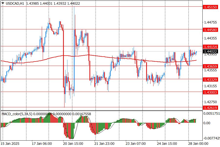 Основной сценарий продвижения пары предполагает прорыв сопротивления 1.4415 (максимум 23 января, сессионный максимум), рост к 1.4460 (максимум американской сессии 21 января) и за тем, может быть к 1.4515 (максимум 21 января).