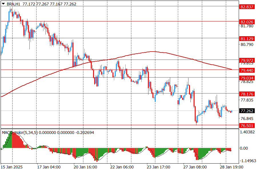 Вчера нефть марки Brent торговалась в диапазоне с 76.85-78.10 - немного выше 2-недельного минимума 76.45, достигнутого в понедельник, и закрыла сессию около цены 77.60. Сегодня нефть начала торги незначительным снижением в диапазоне 77.17-50. На часовом графике Brent остается ниже линии скользящей средней МА (200) Н1 (79.45), но на четырехчасовом графике остается немного выше МА (200) Н4 (76.70). Исходя из вышесказанного, вероятно, стоит продолжать придерживаться северного направления в торговле и пока Brent остается выше MA 200 H4, необходимо искать точки входа на покупку на окончании коррекции.