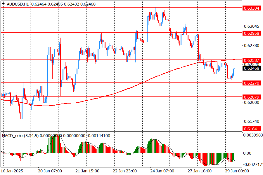 Основной сценарий продвижения пары предполагает прорыв сессионного минимума 0.6230 и может быть снижение к 0.6210 (минимум 21 января)