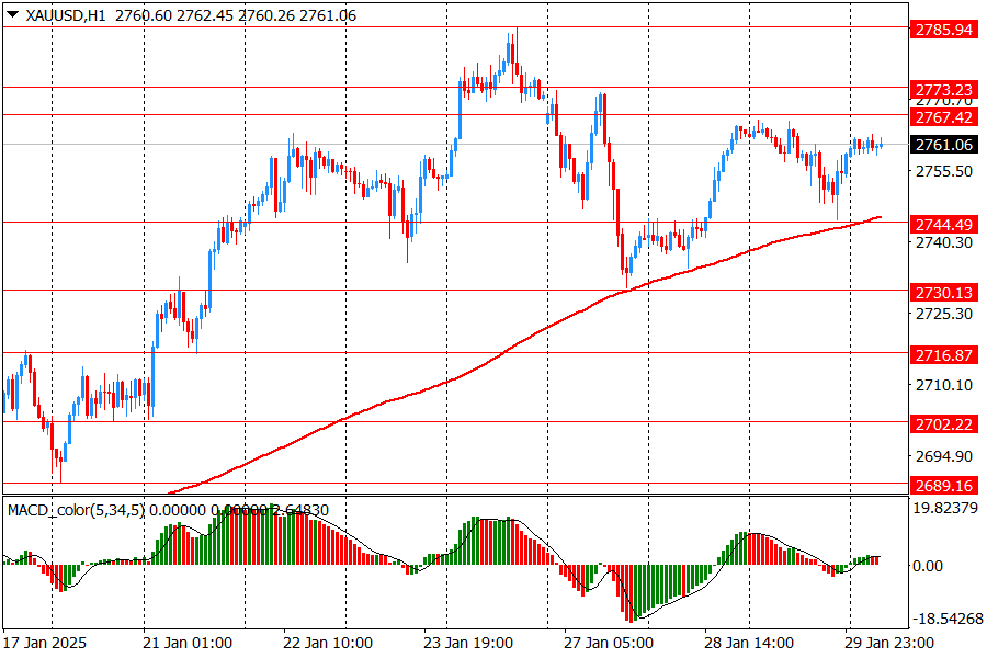 Вчера пара XAU/USD торговалась в диапазоне 2744-2767 и закрыла сессию около цены 2760. Сегодня золото начало торги в узком диапазоне - около уровня закрытия вчерашней сессии. На часовом графике XAU/USD остается немного выше линии скользящей средней МА (200) Н1 (2746) и на четырехчасовом графике выше МА (200) Н4 (2674). Исходя из вышесказанного, вероятно, стоит придерживаться северного направления в торговле и пока золото остается выше MA 200 H1, необходимо искать точки входа на покупку.
