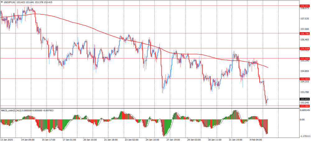 Вчера пара USD/JPY торговалась разнонаправленно: с начала торгов выросла с 154.65 до 155.50, но в ходе американской сессии снизилась до 154.20. Сегодня пара продолжила снижение и опустилась с 154.45 до 6-недельного минимума 153.10. На часовом графике USD/JPY опустилась ниже линии скользящей средней МА (200) Н1 (155.05) и на четырехчасовом графике ниже MA 200 H4 (156.40). Исходя из вышесказанного, вероятно, стоит придерживаться южного направления в торговле и пока пара остается ниже MA 200 H1, необходимо искать точки входа на продажу.