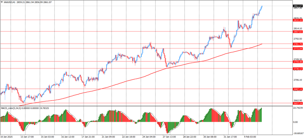 Вчера пара XAU/USD в основном росла с 2807 до уровня закрытия 2845. Сегодня золото продолжило рост с 2840 до нового исторического максимума 2861. Пара пробила сопротивление 2832, которое стало ближайшей поддержкой. На часовом графике XAU/USD остается выше линии скользящей средней МА (200) Н1 (2782) и на четырехчасовом графике выше МА (200) Н4 (2692). Исходя из вышесказанного, вероятно, стоит придерживаться северного направления в торговле и пока золото остается выше MA 200 H1, необходимо искать точки входа на покупку.