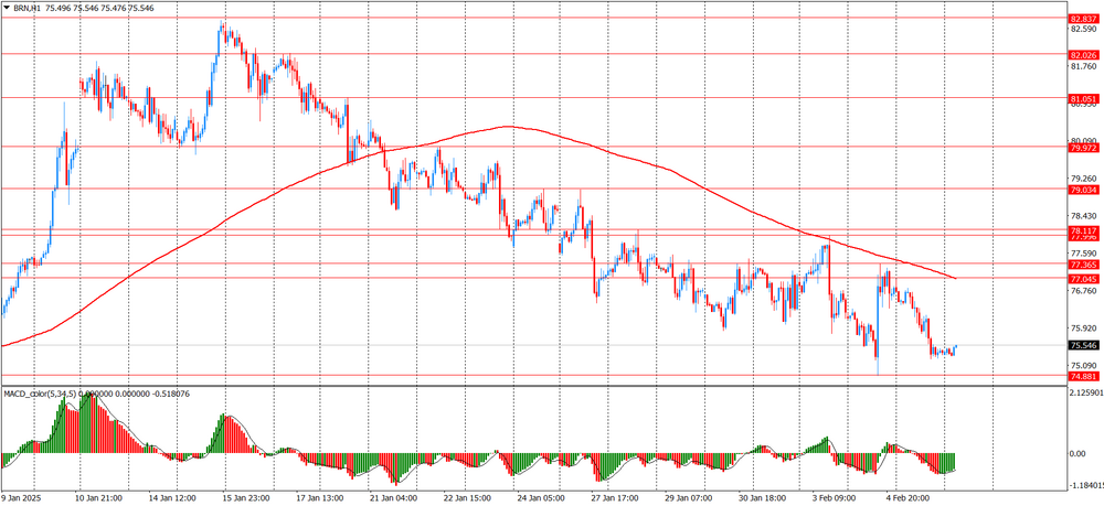 Вчера нефть марки Brent в основном снижалась с 77.04 до 75.24 и закрыла торги около цены 75.38. Сегодня нефть начала торги в диапазоне 75.29-58. На часовом графике Brent остается ниже линии скользящей средней МА (200) Н1 (77.04) и на четырехчасовом графике ниже МА (200) Н4 (77.13). Исходя из вышесказанного, вероятно, стоит придерживаться южного направления в торговле и пока Brent остается ниже MA 200 H1, необходимо искать точки входа на продажу.
