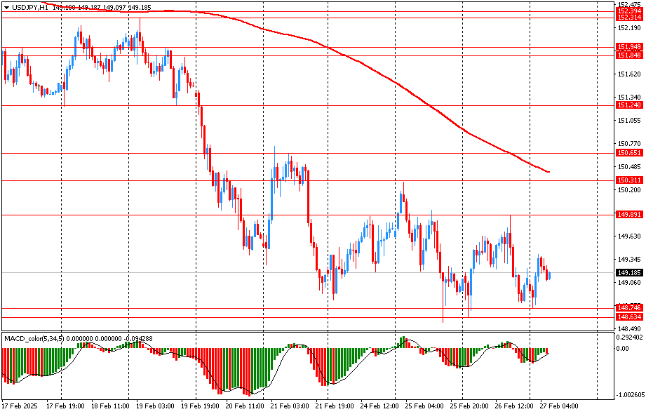 Вчера пара USD/JPY торговалась разнонаправлено в диапазоне 148.65-149.90 и закрыла день без существенных изменений. Сегодня пара также торговалась в узком диапазоне 148.75-149.40, оставаясь вблизи 3-х месячного минимума. На часовом графике USD/JPY все еще торгуется ниже линии скользящей средней МА (200) Н1 (150.40). На четырехчасовом графике ситуация аналогичная. Исходя из вышесказанного, вероятно, стоит придерживаться южного направления в торговле и пока пара остается ниже MA 200 H1, необходимо искать точки входа на продажу на формирование коррекции.