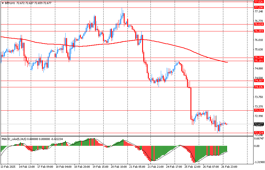 Вчера нефть марки Brent торговалась с понижением и закрыла день в красной зоне около цены 72.70. Сегодня нефть торговалась в узком диапазоне 72.65-75, оставаясь вблизи 2-х месячного минимума. На часовом графике Brent все еще торгуется ниже линии скользящей средней МА (200) Н1 (75.10). На четырехчасовом графике ситуация аналогичная. Исходя из вышесказанного, вероятно, стоит придерживаться южного направления в торговле и пока Brent остается ниже MA 200 H1, необходимо искать точки входа на продажу на формирование коррекции.