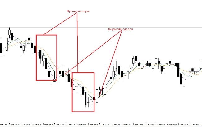 Для открытия короткой позиции необходимо, чтобы средние расположились в следующем порядке — сверху медленная средняя с периодом 8, затем мувинг с периодом 5 и ниже всех скользящая средняя с самым маленьким периодом 3. Если линии индикатором находятся в таком положении, валютную пару можно продавать. Стоп-лосс ставится по последнему локальному экстремуму. Закрывать сделки нужно при развороте мувингов. Пример ордеров на продажу показан на рисунке ниже на примере валютной пары евро-доллар (таймфрейм М5).