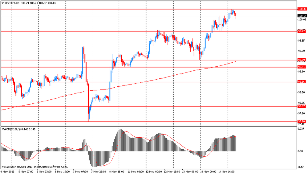 Иена упала ниже уровня Y100 впервые за последние два месяца на фоне роста фондовых индексов Азии и опубликованных вчера негативных данных по росту экономики Японии за третий квартал. Напомним, что рост внутреннего валового продукта замедлился до 1,9%, против 3,8% роста во втором квартале. Экономика Японии сокращается второй квартал подряд. На данный момент инвесторы ожидают итогов заседания Банка Японии, которое состоится уже на следующей неделе, 21 ноября. Почти три четверти экономистов ожидают, что в первой половине следующего года ЦБ будет вынужден увеличить объем стимулирующих программ.