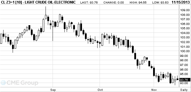 Стоимость декабрьских фьючерсов на американскую легкую нефть марки WTI (Light Sweet Crude Oil) снизилась до $93,60 за баррель на Нью-Йоркской товарной бирже.