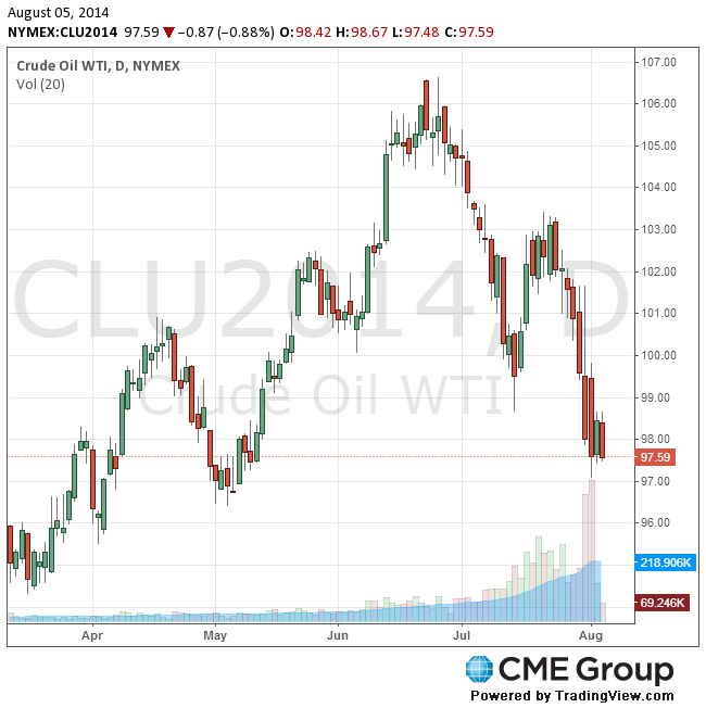 Стоимость сентябрьских фьючерсов на американскую легкую нефть марки WTI (Light Sweet Crude Oil) снизилась до $97,48 за баррель на Нью-йоркской товарной бирже (NYMEX).