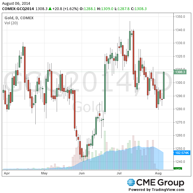 Стоимость августовского фьючерса на золото на COMEX сегодня выросла до $1309.00 за унцию.