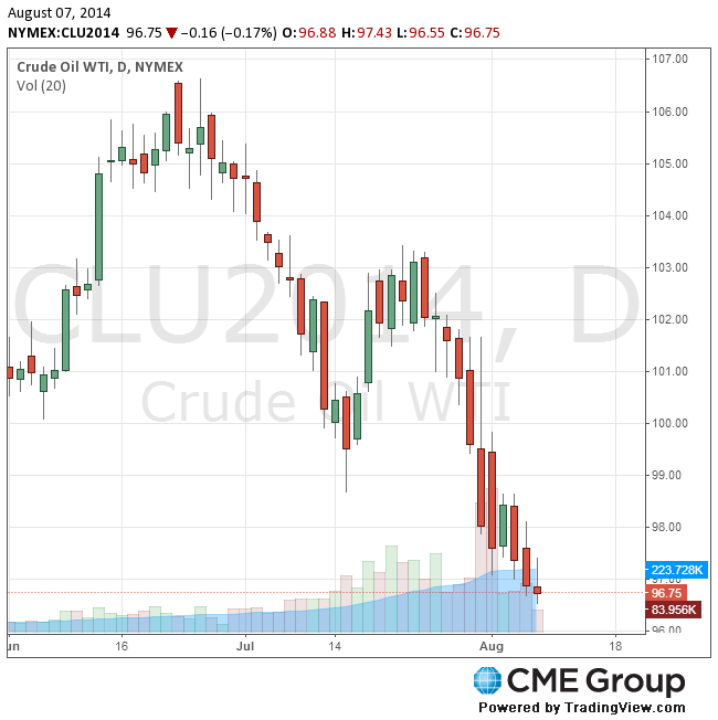 Стоимость сентябрьских фьючерсов на американскую легкую нефть марки WTI (Light Sweet Crude Oil) снизилась до $96,55 за баррель на Нью-йоркской товарной бирже (NYMEX).