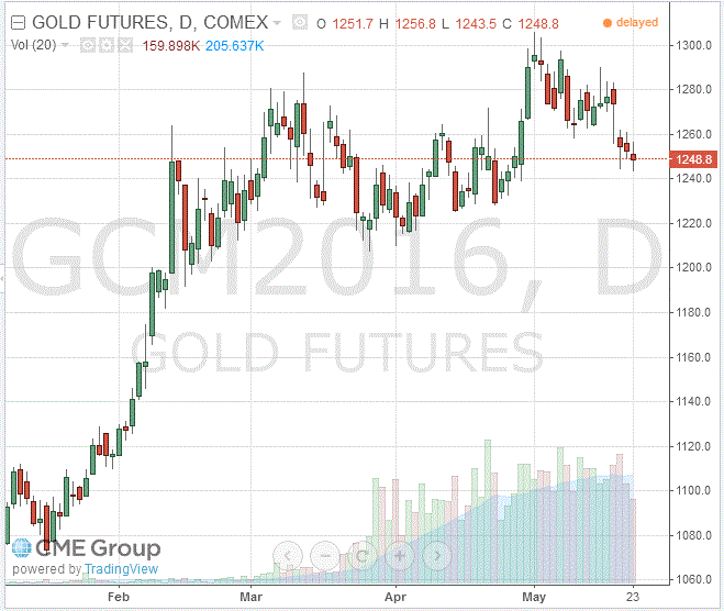 Стоимость июньского фьючерса на золото на COMEX упала до $1248,8 за унцию.