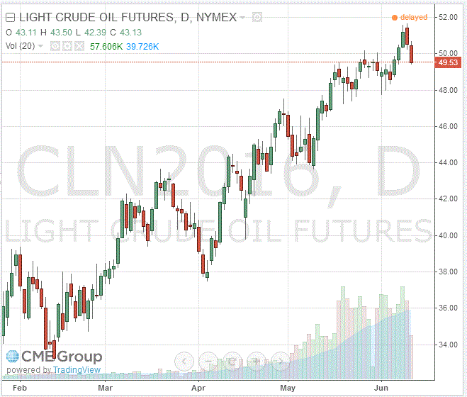 Стоимость июльских фьючерсов на американскую легкую нефть марки WTI (Light Sweet Crude Oil) упала до 49,53 доллара за баррель.