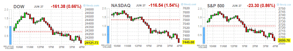 Основные фондовые индексы США растеряли все ранее заработанные позиции, и завершили сессию в минусе, что было связано с беспокойством рынка по поводу торговли, а также падением акций технологического сектора.