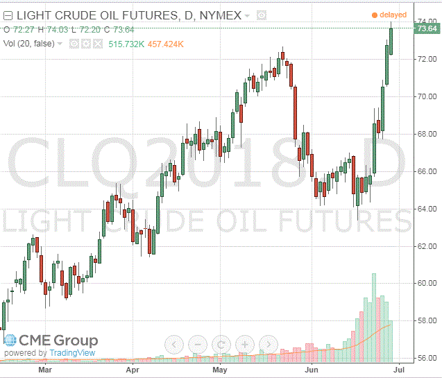 Стоимость августовских фьючерсов на американскую легкую нефть марки WTI (Light Sweet Crude Oil) выросла до 73,64 доллара за баррель на Нью-йоркской товарно-сырьевой бирже.