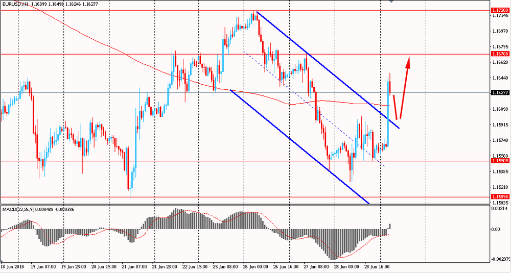 Пара EUR/USD сегодня утром резко выросла к $1.1650, продолжив вчерашний подъем. В четверг пара, оттолкнувшись от линии поддержки нисходящего канала, выросла и закрыла день с небольшим повышением. На данный момент евро удалось пробить линию скользящей средней MA 200 H1 и сейчас быки пытаются закрепиться выше нее. Более того, единая валюта вышла из общего нисходящего канала в северном направлении и пара, вероятно, сменит тренд на восходящий.